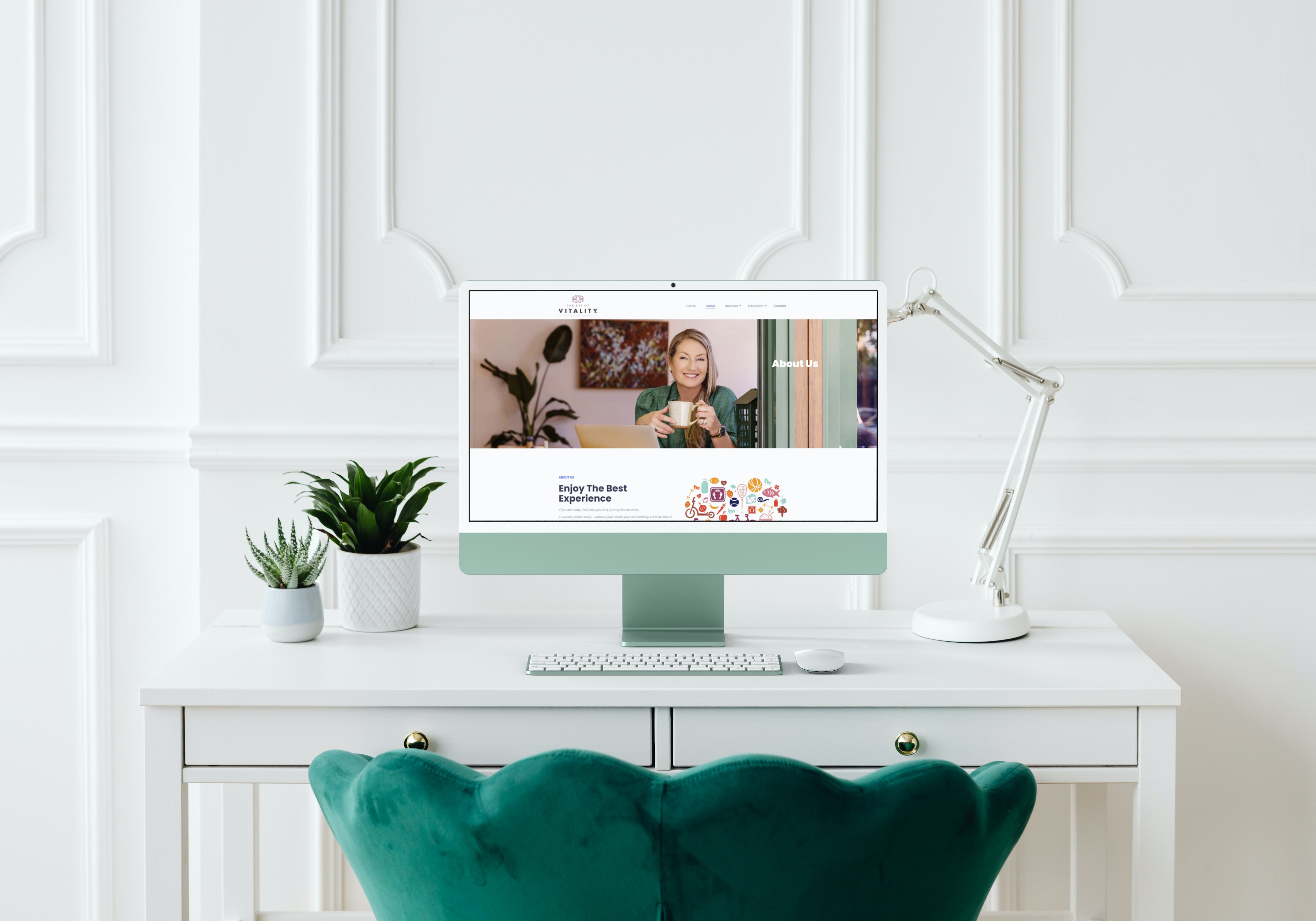 Green iMac on the modern table near the flowers_scrrenshot